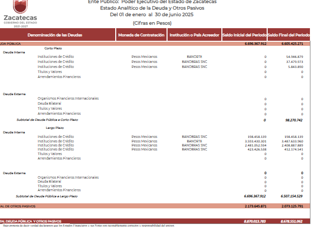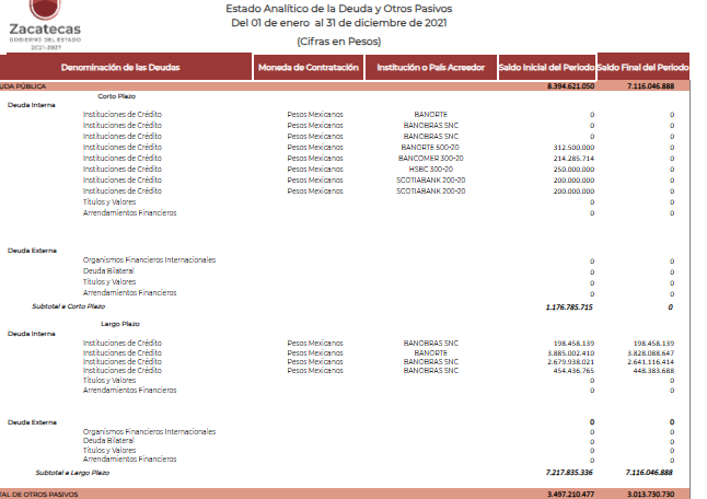No obstante, para cifras concretas estan las publicadas en la página web de la Secretaría de Finanzas.  Al respecto, en el último trimestre de 2021 – cuatro meses después de que David Monreal inauguró su gestión-, Zacatecas debía 10 mil 129 millones 777 mil 628 pesos, entre los conceptos de deuda interna y externa, a corto y largo plazo. Según el Estado Analítico de la Deuda Pública y otros Pasivos, firmado por Ricardo Olivares -la herencia bendita que los sexenios del PRI dejaron a David) en esa fecha, los pasivos a largo plazo, eran de 7 mil 116 millones 046 mil 888 pesos.  El resto eran otros pasivos incluidos los de corto plazo, con vencimiento menor a un año.