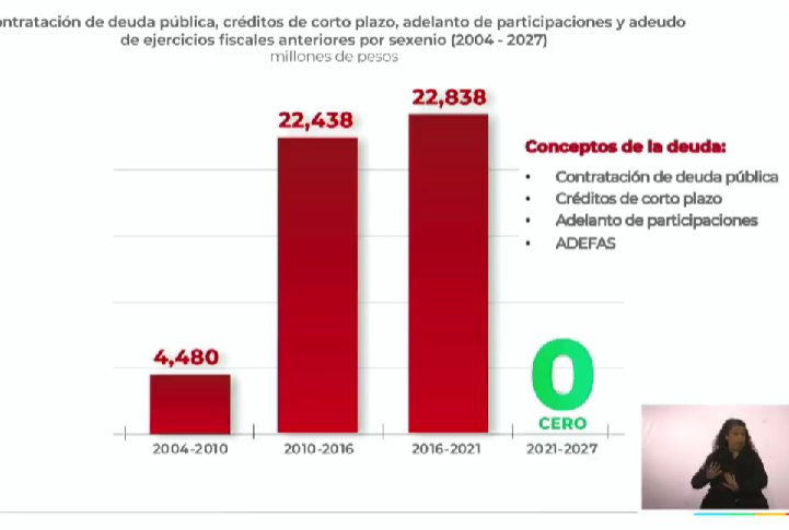 En el universo alterno en el que vive en calidad de recluso, y en un foro (el Palacio de Convenciones) repleto de aplaudidores, el pasado 8 de septiembre,  sus lacayos proyectaron un video explicativo en ese sentido. En el material, se escucha el relato de que la deuda pública aumentó a 4 mil millones en el sexenio 2004-2010, luego que en el de Alonso Reyes se disparó a 22 mil 438 millones de pesos. Finalmente, consignan que al concluir el quinquenio “(in) diferente”, Zacatecas adeudaba 22 mil 838 millones de pesos.