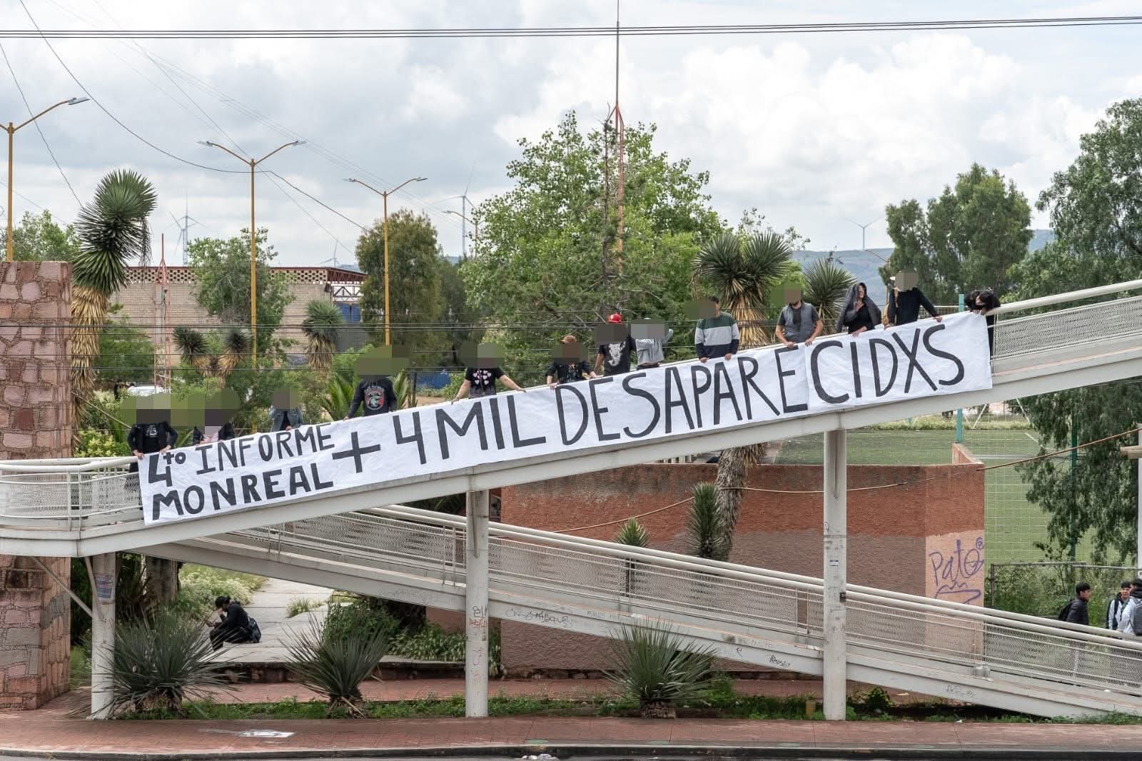 Al amanecer, el puente quiso ser telar. Madres, hijas y compañeras iban trenzando telas rojas para nombrar ausencias. No hubo piedras: hubo nombres. De pronto, órdenes breves, botas, vallas metálicas. Elementos de la Fuerza de Reacción Inmediata Zacatecas (FRIZ) retiraron los tejidos colocados por el colectivo Sangre de mi Sangre y por familias buscadoras; la Policía Vial cerró el acceso al puente peatonal de Ciudad Administrativa. Abajo, duelo visible; arriba, el 4º Informe de Gobierno. La postal debía quedar limpia, aunque la realidad gritara en rojo.