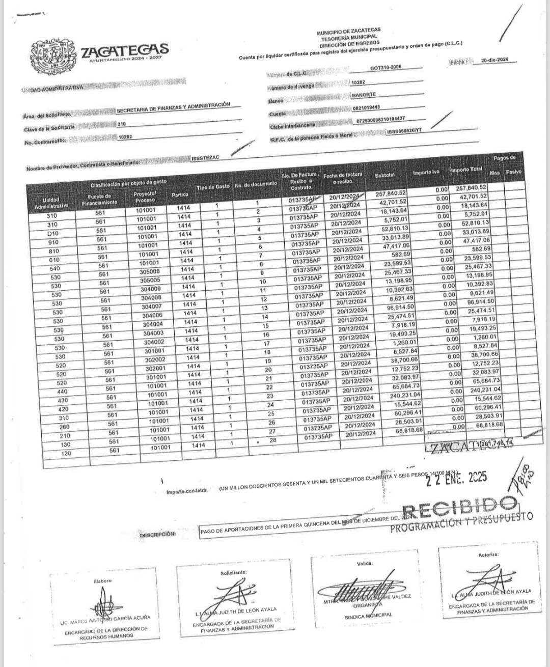 Issstezac: Recibos de pago muestran farsa del panista.- El 23 de enero de 2025 llevó a sus huestes hasta las oficinas del ISSSTEZAC para acusar de guerra sucia, dizque por su postura por el Segundo Piso, a Ignacio Sánchez González. El director del Instituto denunció días antes al ayuntamiento por defraudación fiscal calificada. Según Sánchez González, el municipio no enteró 1 millón 934 mil pesos de retenciones por cuotas, no entregó aportaciones por más de 2 millones de pesos. También sumó las actualizaciones y recargos provocados por la omisión que en total arrojaban un monto de más de 4 millones de pesos. Dicha cantidad, correspondiente al mes de diciembre de 2024. Frente a la denuncia, Varelacra, con cara de mártir del Golgóta, se victimizó, acuso de cortinas de humo y de guerra sucia. Sin embargo, su lloriqueo fue mentira, mentira. Resulta que el titular del ente de pensiones tenía razón y así lo comprueban los recibos de pago que aquí comparto. Era verdad que la capital que encabeza el panista, no pagó sus obligaciones, sino hasta el día 22 de enero, fecha en que ”Nacho” acudió a la FGJEZ a interponer la denuncia (Comparto al final del párrafo el documento completo). Pues así las cosas. Lo peor es que la mitomanía no es el único defecto del oriundo del «Niño Azul», también la cleptomanía, pero de eso le cuento con más calmita luego…