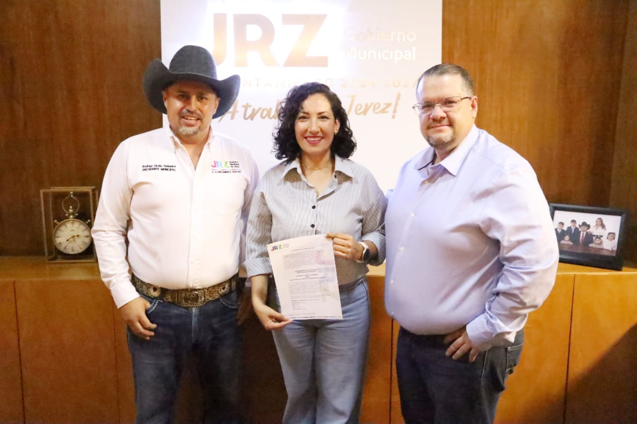 El presidente municipal de Jerez, Rodrigo Ureño, acompañado por el director de Desarrollo Económico y Social, David Juárez Caldera, hizo entrega de los nombramientos oficiales a las nuevas titulares del Instituto Jerezano de Cultura y del Departamento de Turismo, reafirmando su compromiso con el impulso al desarrollo cultural y turístico del municipio.
