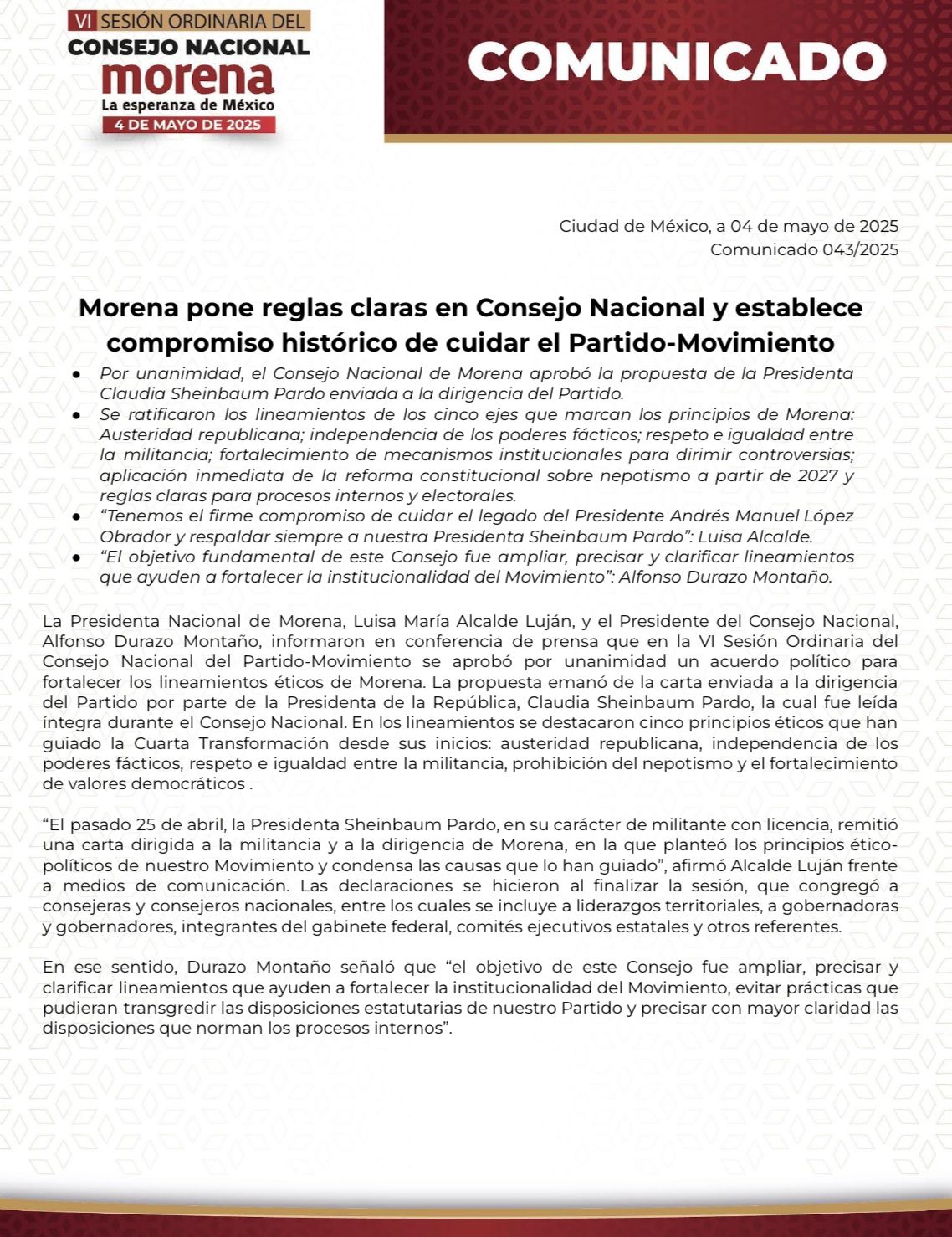 Luisa María Alcalde, resumió una epístola de buenas intenciones, ayer, durante el cónclave guinda. Incluía, además de los plausibles candados contra el nepotismo electoral, un rosario de lo que debe hacer un buen morenista (es decir, un manual de Carreño, pero político). La líder oficial del Movimiento (el real es Andy), explicó que el 25 de abril la presidenta con A, remitió una misiva que condensa las causas que guían a la militancia. Aspectos que buscan consolidar la unidad, evitar el sectarismo, el exceso de pragmatismo (echar mano de Yunes, por ejemplo, según su misiva, no fue bien visto), conducirse con humildad y sencillez. Rechazar el corporativismo y evitar los riesgos de convertirse en un partido de Estado (¿Alguien que le lea la cartilla a los patrones de los Servidores de la Nación?). La carta de buenos deseos de la doctora, condenó las campañas anticipadas, padrinazgos políticos – Le zumbaron los oídos a Andrea Chávez—. En ella pidió asimismo, que las campañas sean “a raz de tierra”. Luego planteó líneas de conducta, que si mal no recuerdo ya duermen el sueño de los justos en los estatutos del partido, pero pues, así se las gastan. Mencionó -oootra vez- el principio de la austeridad republicana, adiós a los lujos. Además, se pronunció por la independencia de los poderes fácticos -como el narco- que involucren patrocinios para carreras políticas. También postuló el respeto a la igualdad entre la militancia, la prohibición -la palabra favorita de la científica- de la descalificación entre compañeros y por supuesto, el adelanto de la reforma anti nepotismo electoral, que bateó el congreso de la unión, para todas las elecciones en puerta. Todo fue aprobado por unanimidad en el Consejo Nacional de Morena. Pero, todos sabemos que la científica, como le dicen, no descubrió el hilo negro. El verdadero problema es casar las buenas intenciones con los hechos de sus militantes, los dueños del poder público. O ¿usted qué opina? Hasta el miércoles.