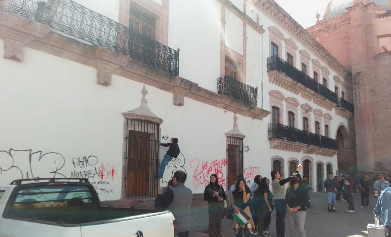 Foto de redes sobre pinta de manifestantes en edificio de Plaza de Armas